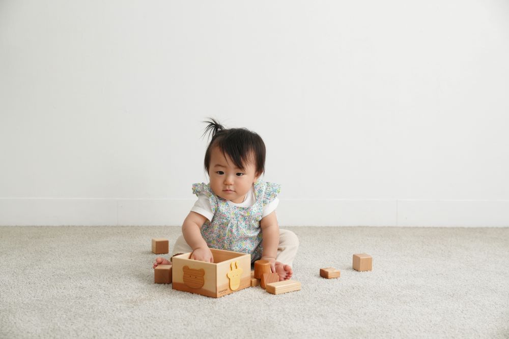 This block set uses several kinds of Japanese hardwoods, including cherry, maple, and chestnut. Each type of wood has its own natural color, weight, and texture. As babies play, they naturally notice these differences through touch and movement. It is a toy that allows children to learn directly from real wood—an experience that single-material plastic toys cannot offer.