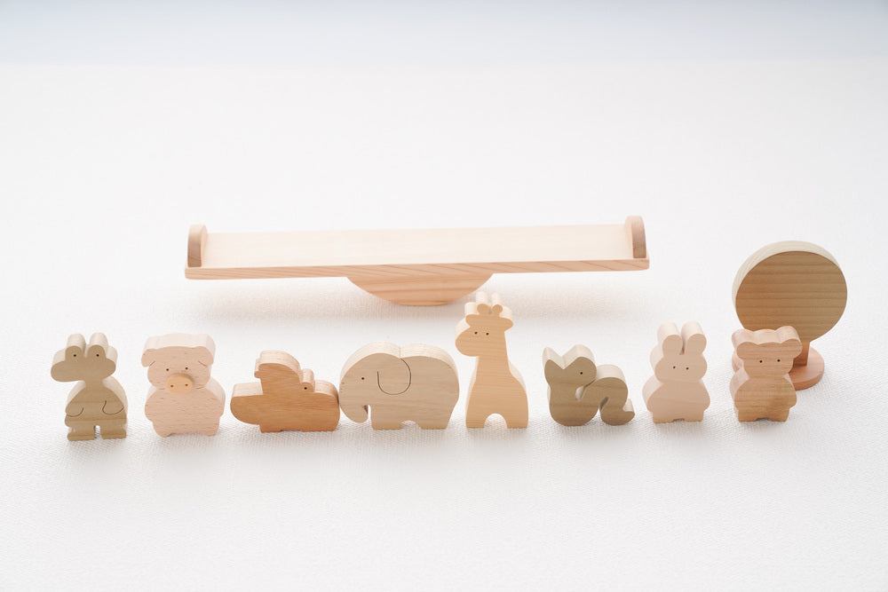 This is a wooden seesaw game where children place animals of different sizes and watch how the seesaw moves. Try placing the large elephant on one side, then balance it with smaller animals such as the rabbit, bear, and pig. Through hands-on play, children naturally begin to understand the relationship between size, weight, and balance.