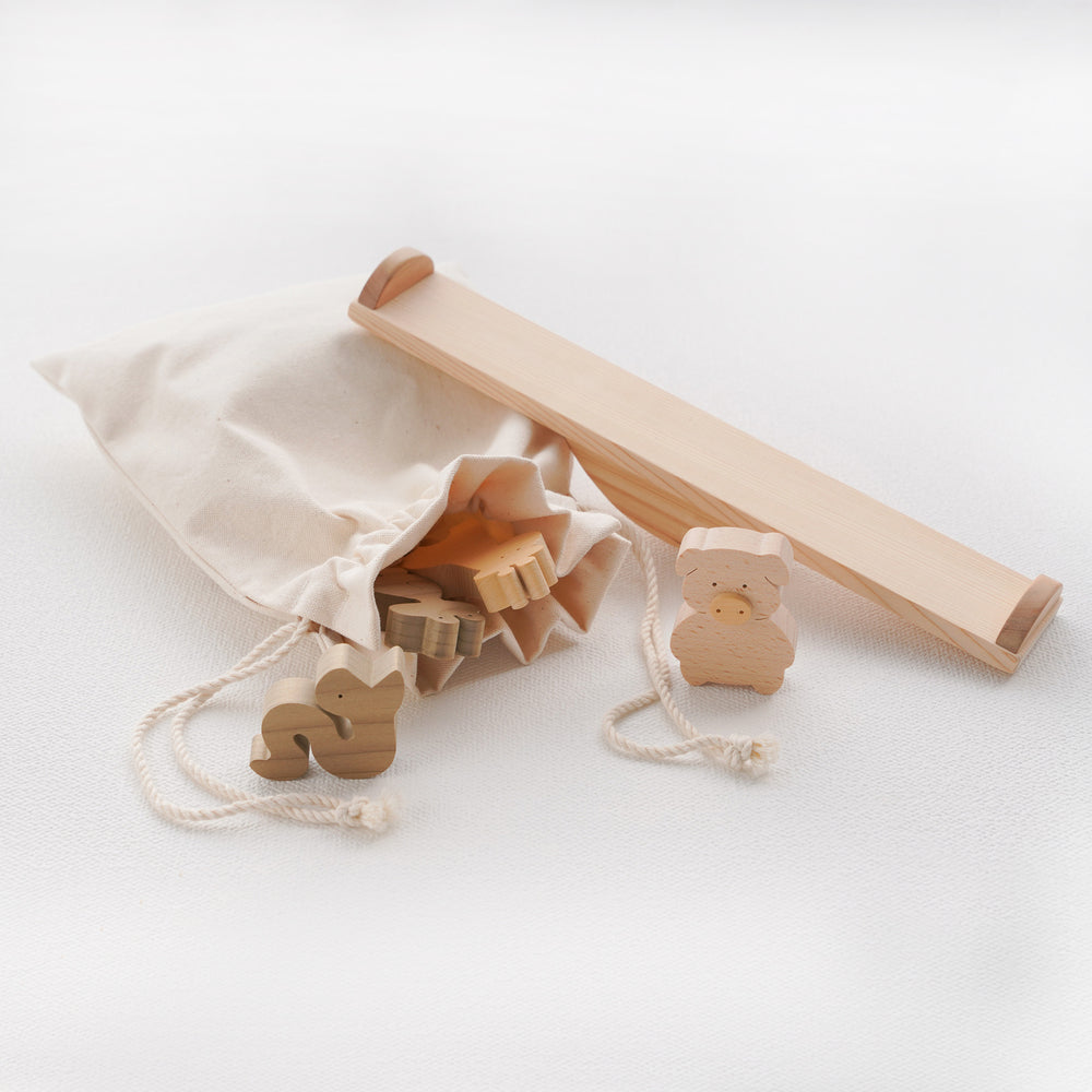 Each piece is carefully crafted from natural wood, with attention paid to the individual character of each animal. The seesaw and all figures are left unpainted and uncoated, allowing children to enjoy the natural texture and warmth of the wood.